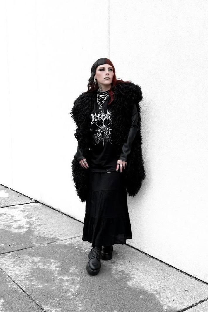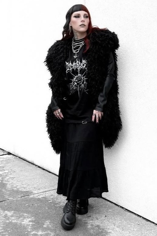 フェイクファーのジレにレザージャケットを重ねているようなデザイン