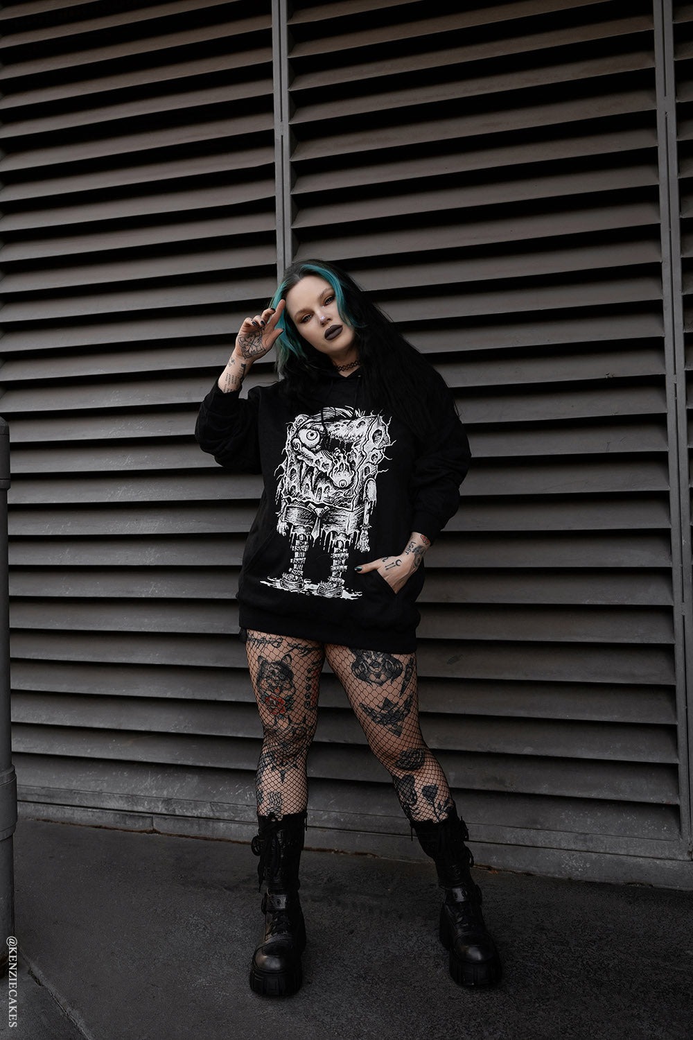 厚底ブーツにエモスタイルのボブパーカー