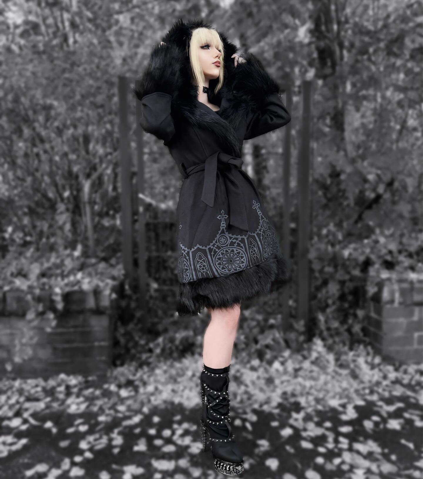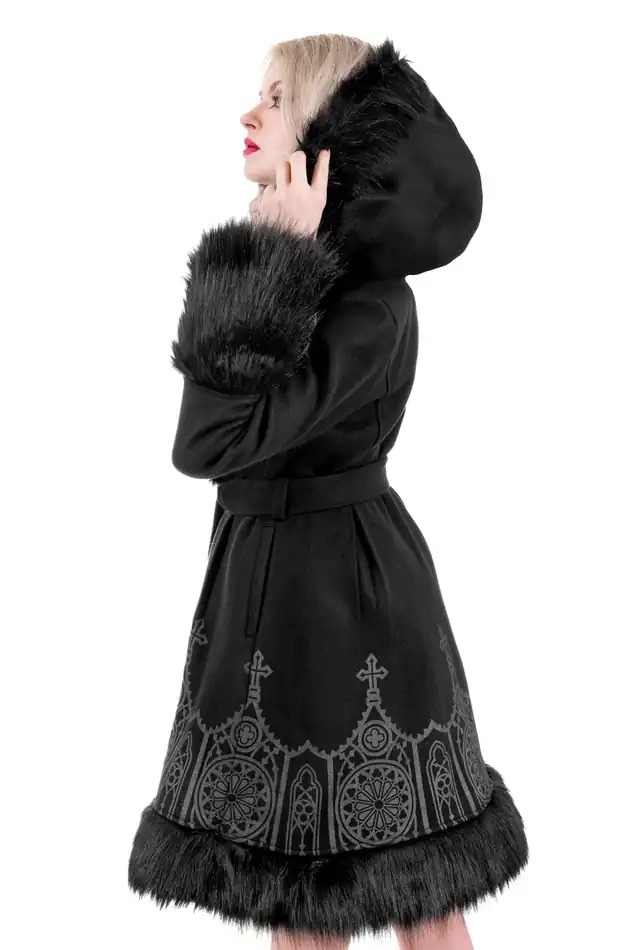 - フード、ラペル、裾、袖口にヴィンテージ風のフェイクファー