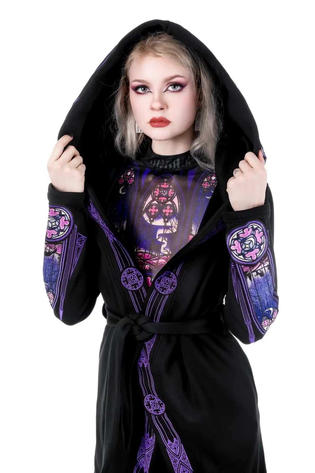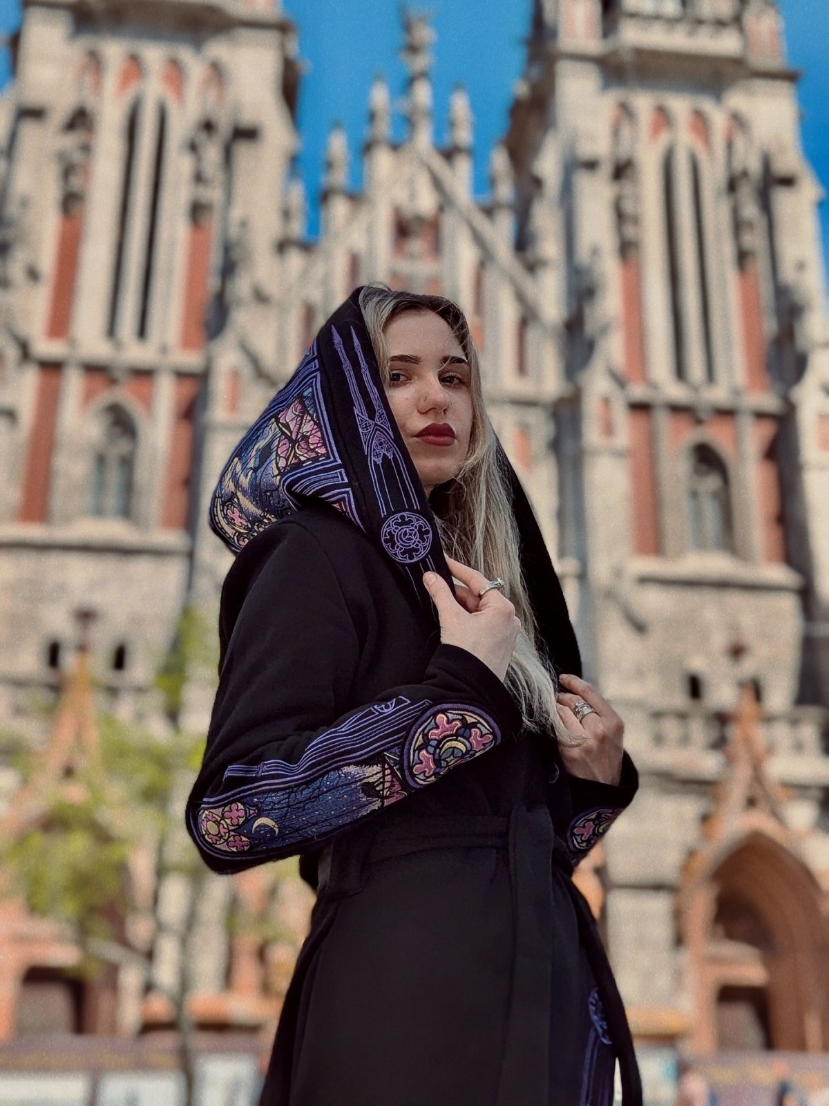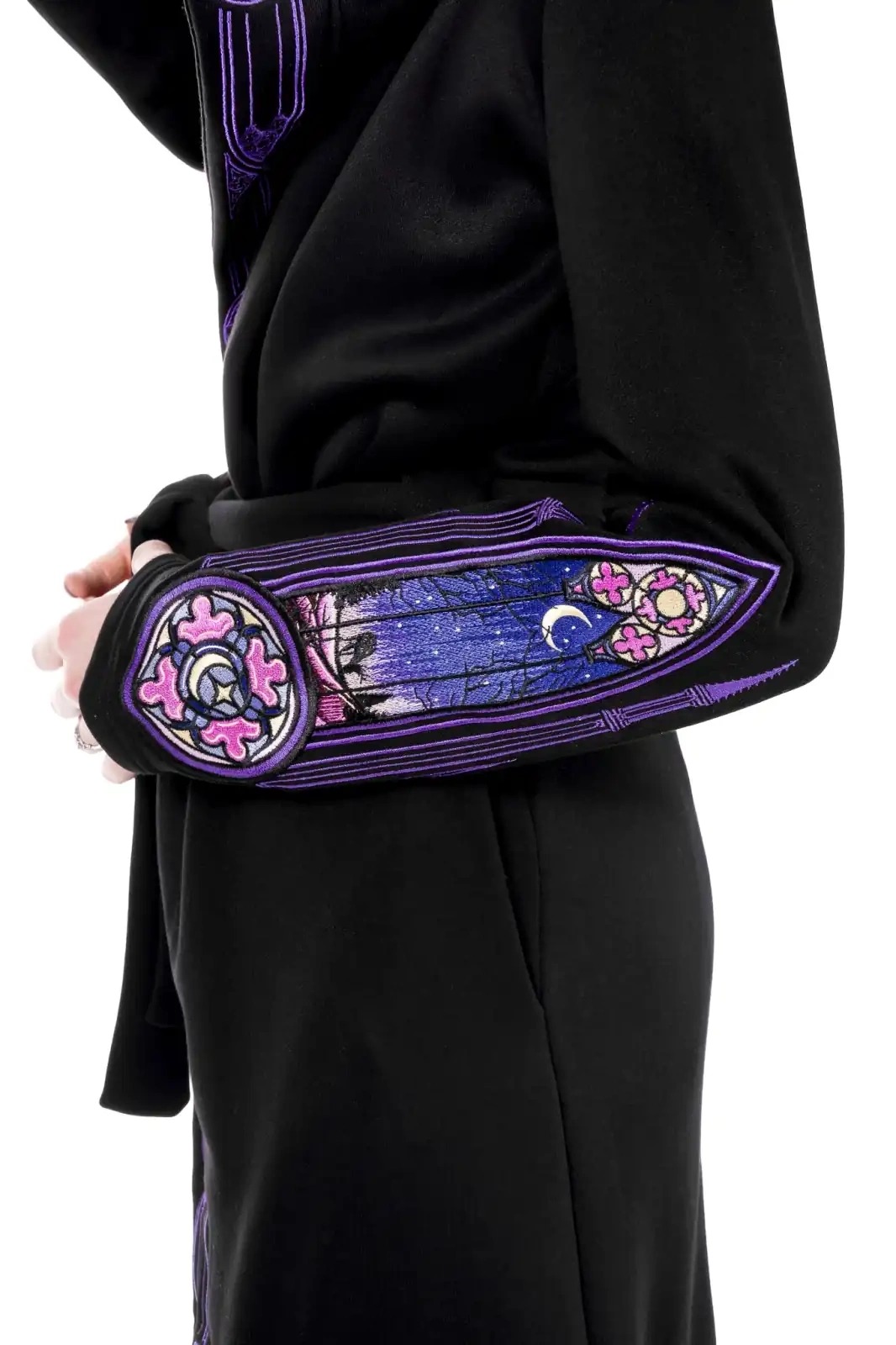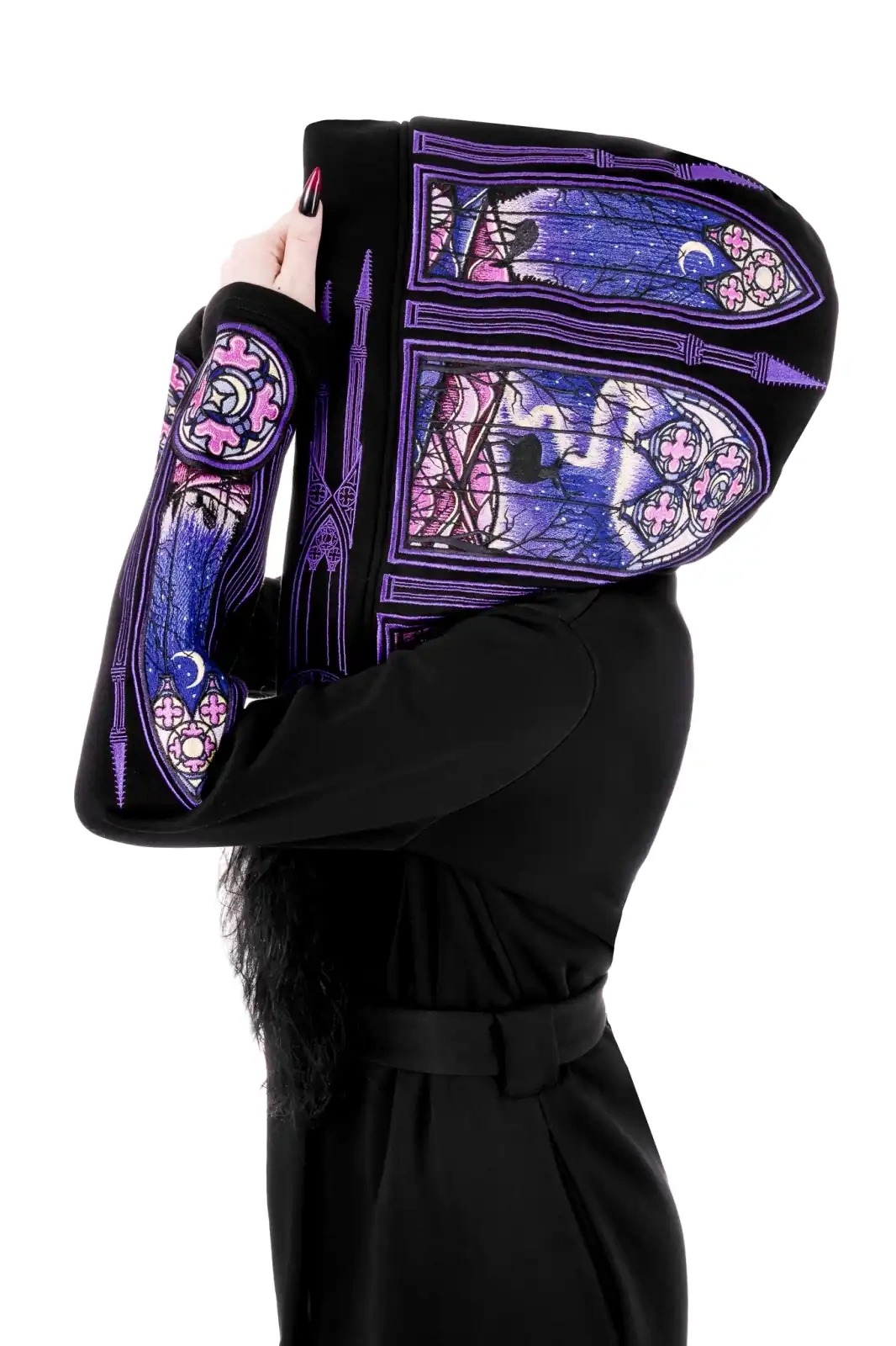 - フード、フロント、袖にはゴシック様式の大聖堂やオーロラ刺繍