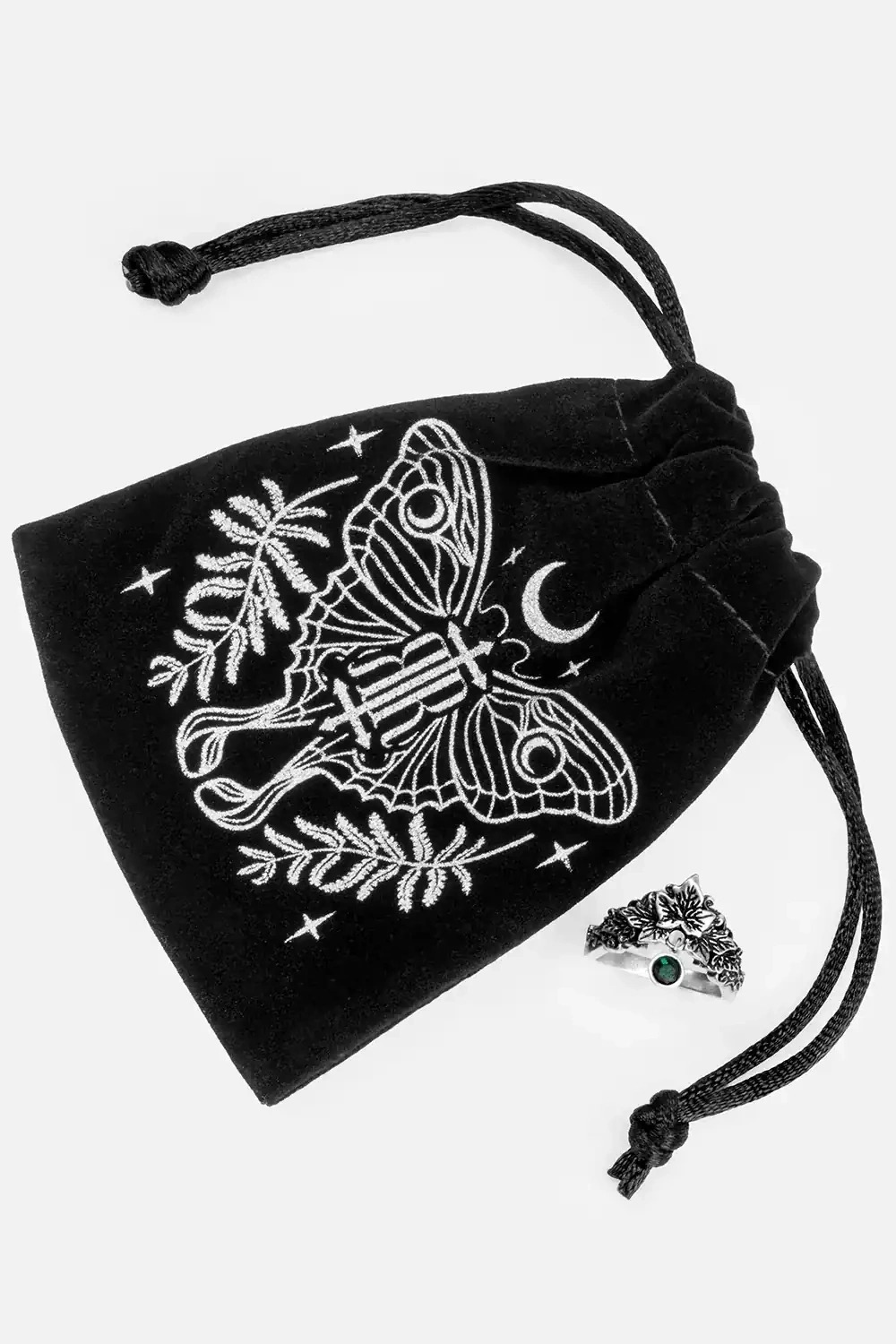 - 蛾のプリントが施された黒いベルベットの巾着袋付き