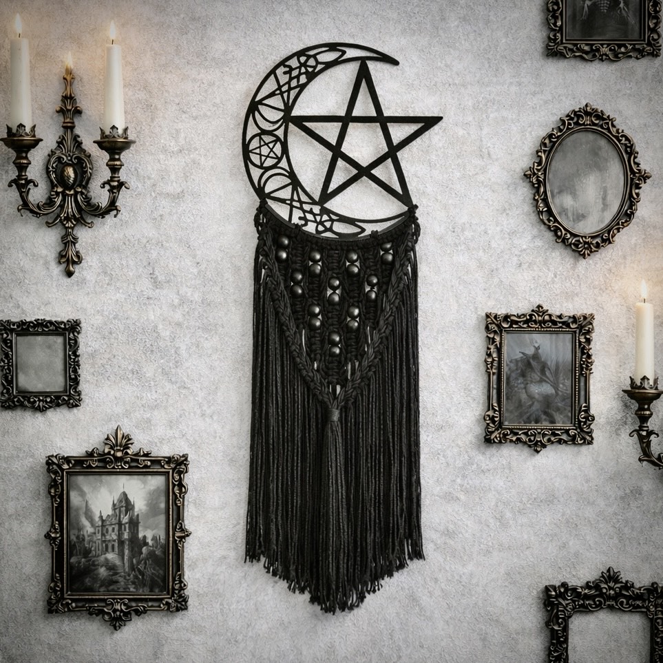 - 三日月・魔法の印章・ペンタグラムを組み合わせたダークで象徴的なデザイン