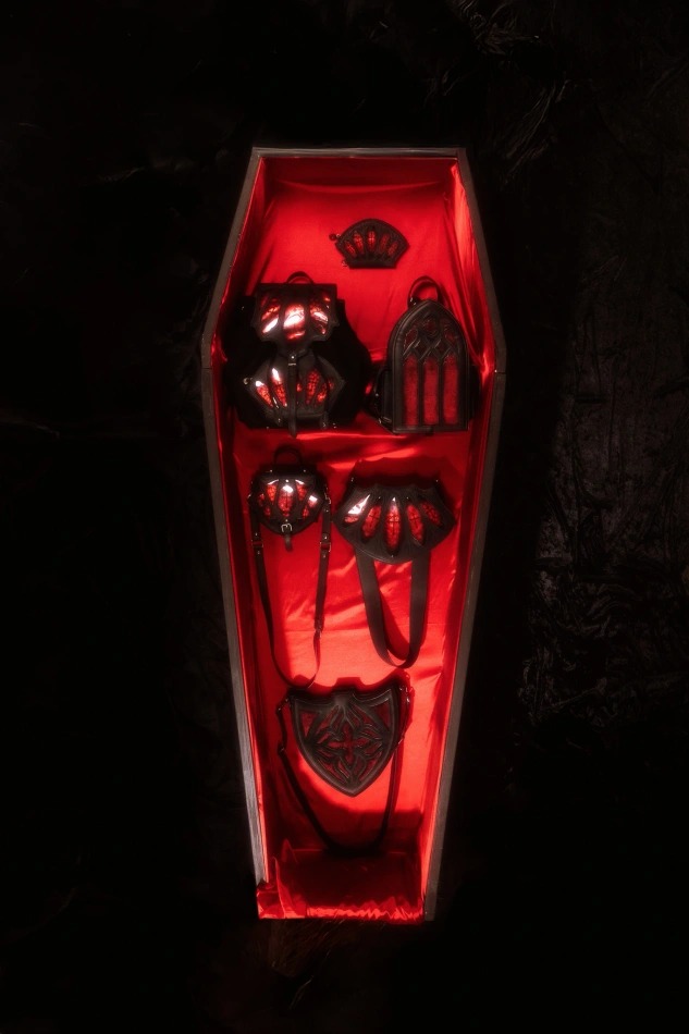 - 血のような深紅の裏地がダークで吸血鬼な雰囲気を演出