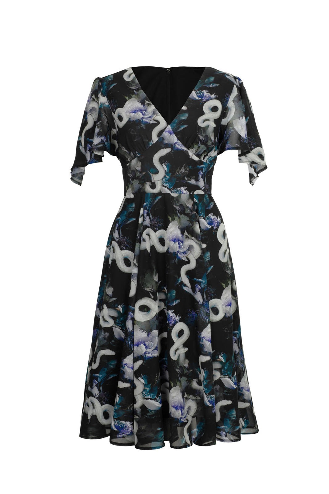 蛇と花柄が妖しく映えるシフォンミディドレス