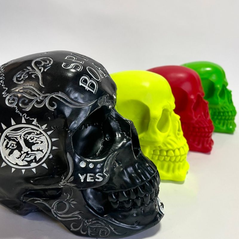 スピリットボードが頭部にプリントされたスカルの置物